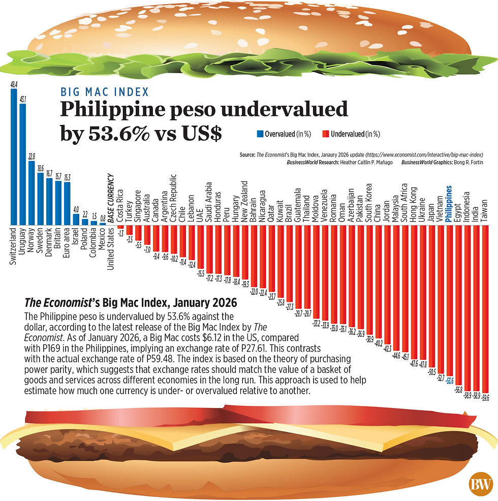 The Philippine peso is undervalued by 53.6% against the dollar, according to the latest release of the Big Mac Index by The Economist. As of January 2026, a Big Mac costs $6.12 in the US, compared with P169 in the Philippines, implying an exchange rate of P27.61.